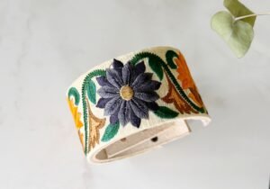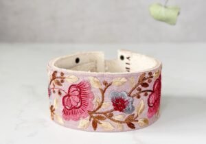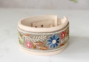POSA MATE en cuero suela, con su aplique en galón bordado, todos los posa mates tiene 4 medidas para regular el diámetro del mate.